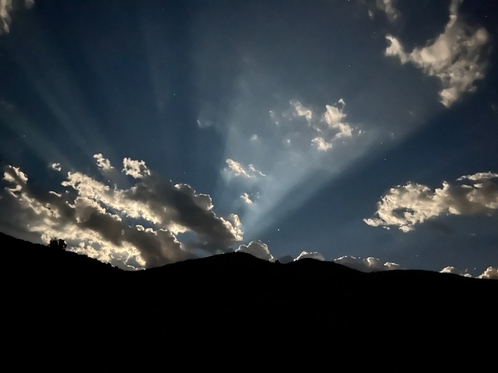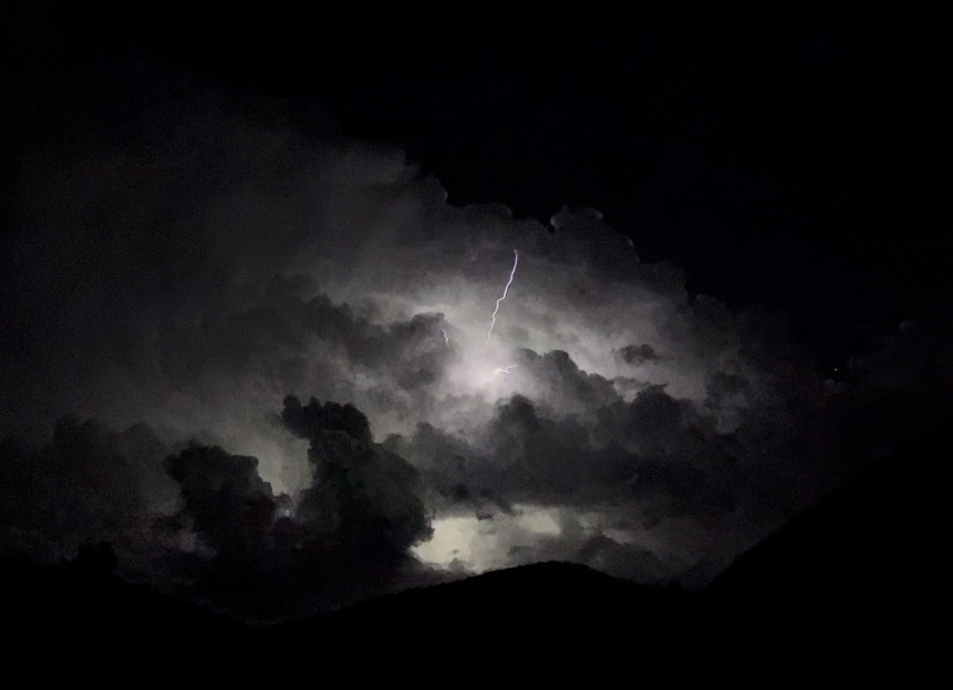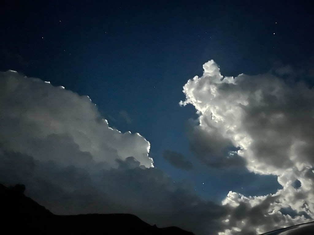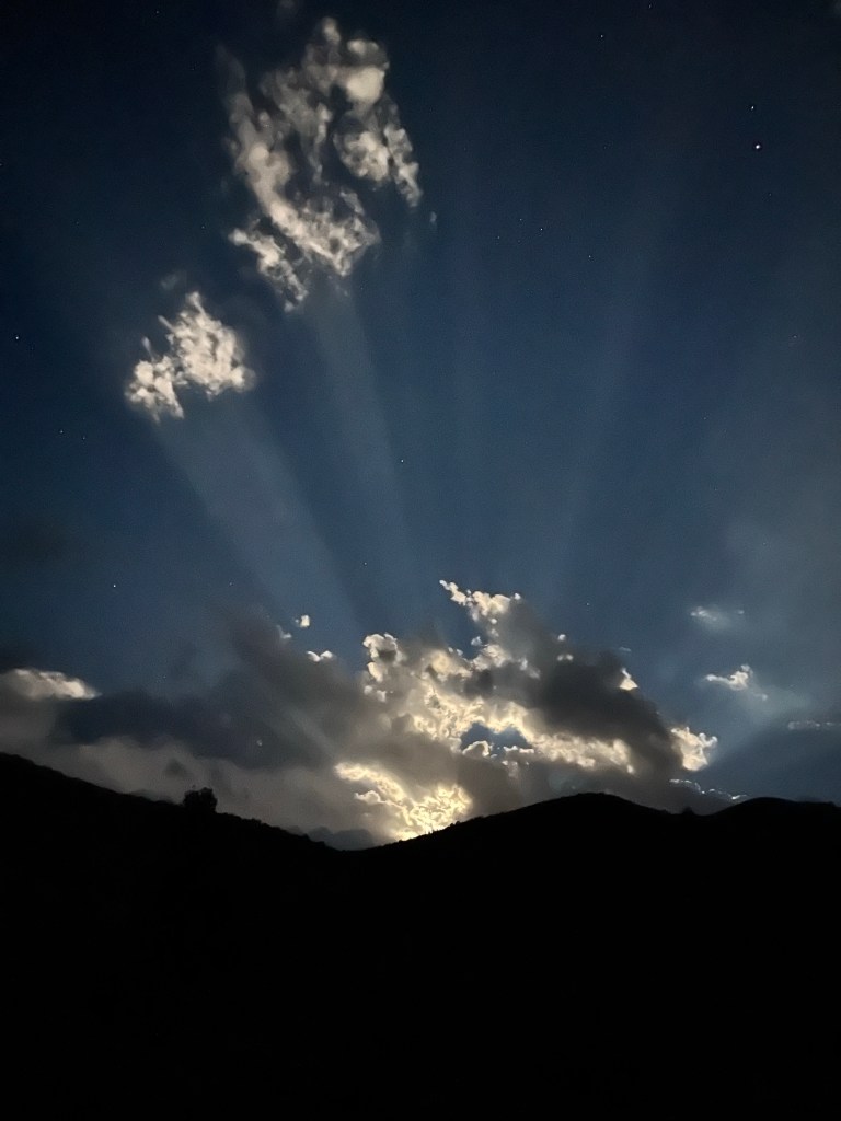 The storm moves behind the mountain. I am left with the growing light of the moon.